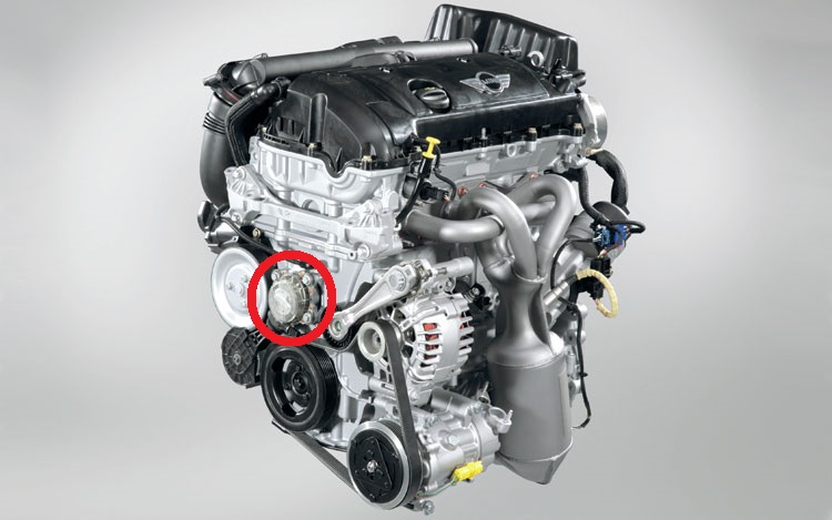 Das Antriebsrad der Wasserpumpe lässt sich entkuppeln, indem du an dem von dir rot eingekreisten Spannarm den Stift raus ziehst.