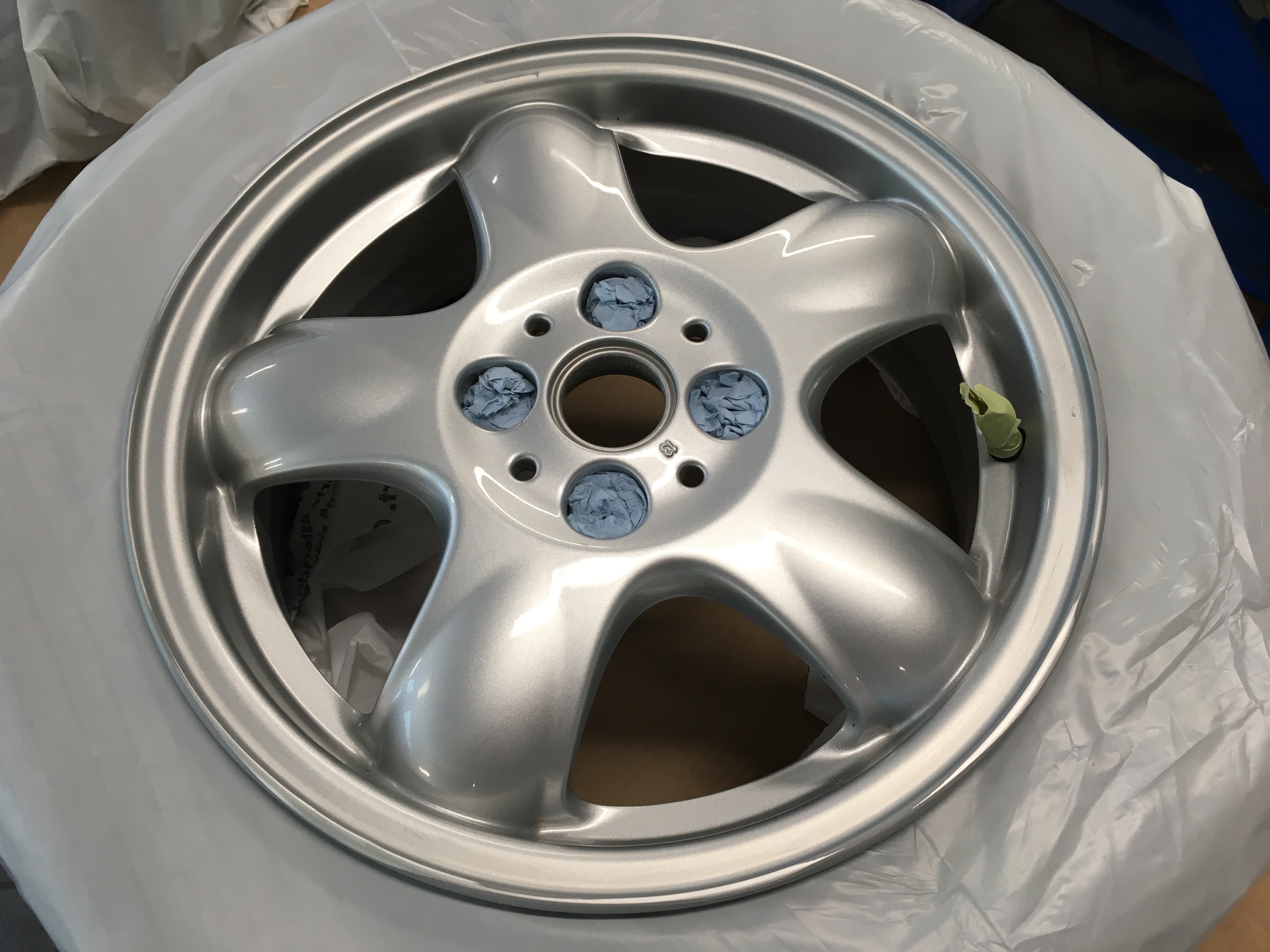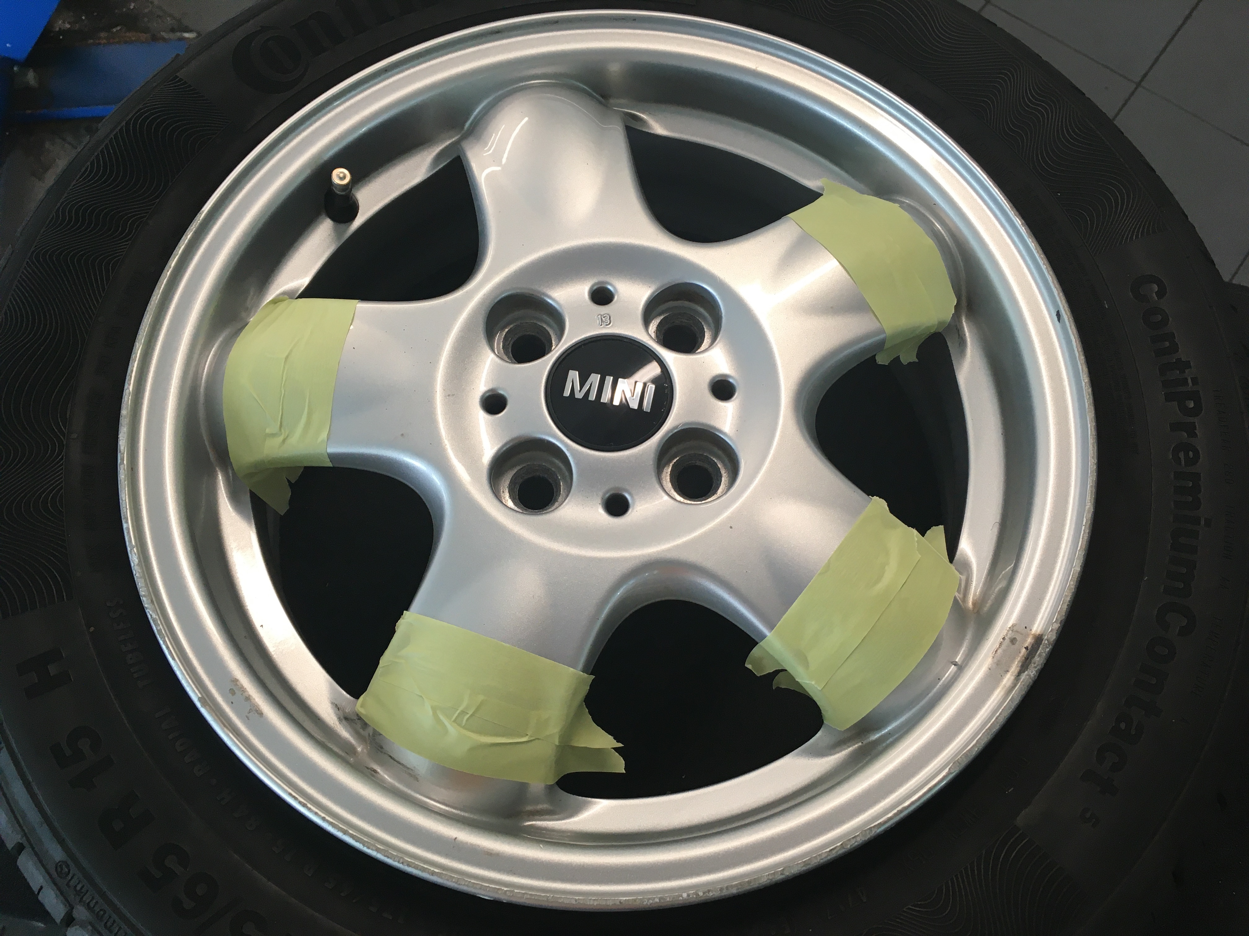 Die Felgen wurden gereinigt, die Reifen mit Folie abgedeckt und Ventile abgeklebt. Ebenso wurden die Löcher für die Radschrauben, oder präziser formuliert, die Schraubenauflage der Bolzenlöcher, vor dem folgenden Sprühnebel geschützt. Danach wurde die Oberfläche nochmals gereinigt und schlussendlich entfettet um sie auf die nächsten Schritte vorzubereiten.