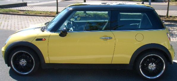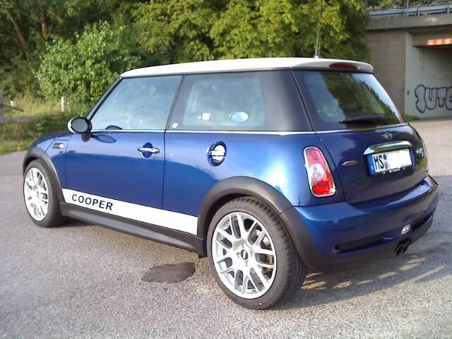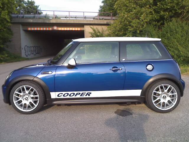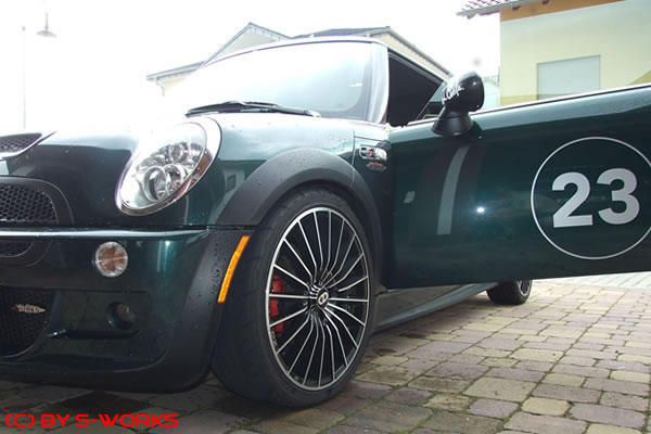 Das Schöne ist: Da die Einpresstiefe der BBS-Felgen geringer ist als die der serienmäßigen MINI S-Speiche und auch noch einen halben Zoll breiter sind, schließt der Radsat absolut bündig mit der oberen Kante der schwarzen Kunststöff-Kotflügel ab.