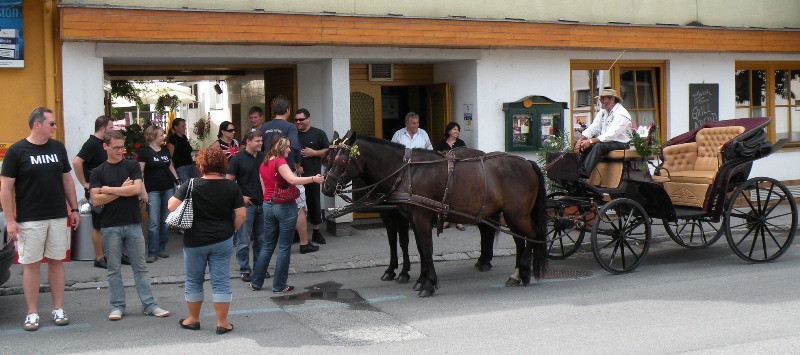 Der Geschriebenstein! Eine etwas hölzerne Bezeichnung für eine echt lässige Kombination aus zauberhafter Waldlandschaft und Straßen, die sich alle paar Meter in eine andere Richtung der drei Dimensionen schlängeln!     Top Auf jeden Fall lotste uns der Straßenverlauf zur Burg Schlaining     Hier herrschte erstaunliche Disziplin! Während die MINIs am Parkplatz standen, parkten die Fahrer richtigerweise am für sie vorgesehenen Trottoir.     Zwinkern Nach dieser kurzen Pause, welche offensichtlich genutzt wurde, um die fabelhafte Stimmung weiter in die Höhe zu schrauben     konnte Snooper einen Artgenossen für sich begeistern.     Augenrollen