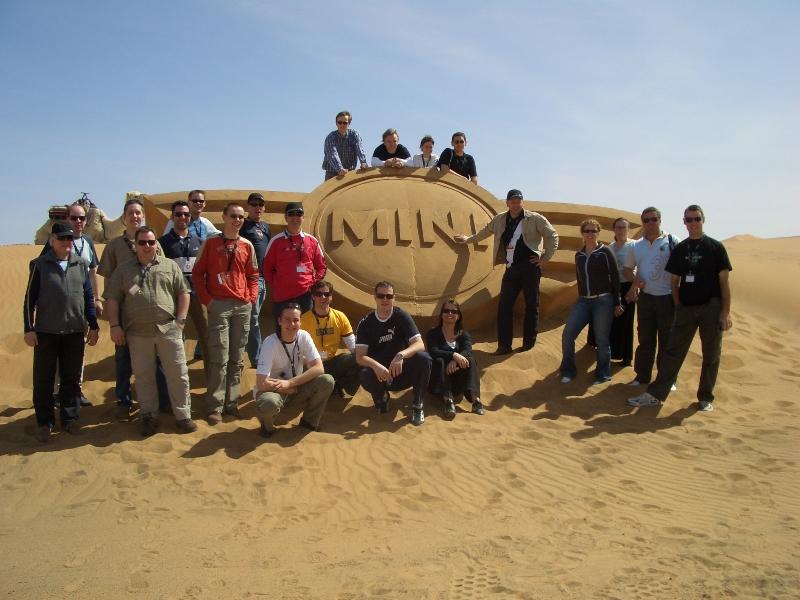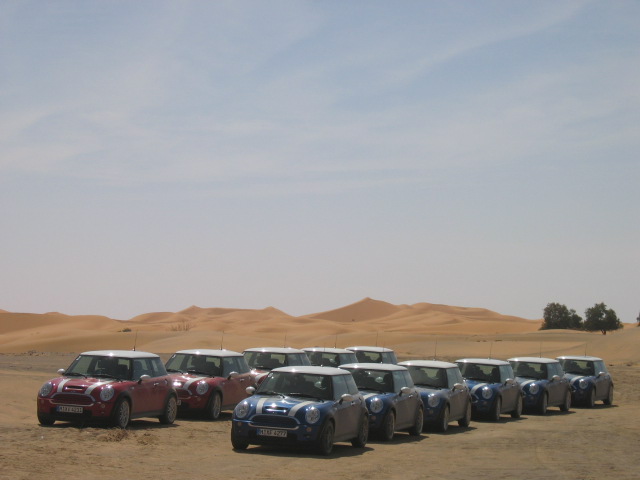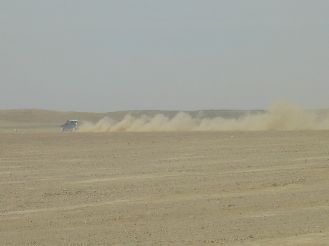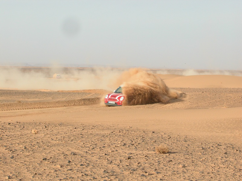 Aber es kommt noch besser! Frage vom Timo: „Wollts eine Runde mitfahren?“ Anwort unsererseits: …. Na was glaubt ihr?     Das war das Einzige Foto, das was geworden ist! Ich sags Euch: EIN WAHNSINN!!! Als wir vorher um die Kurven drifteten, haben wir uns kindisch gefreut als ein wenig Sand auf Höhe der Seitenscheibe durch die Vorderräder an uns vorbei geworfen wurde. Wenn allerdings ein Timo am Steuer sitzt, dann ist da nicht ein Staubkorn. Nein, da ist eine ganze WAND! eek! Er hat den Boden dort umgepflügt als wollte er Bäume pflanzen! Einzig der Blick nach Vorne blieb uns gewahrt. Sonst waren wir ringsum von Sandwänden umgeben. Fördert den Tunnelblick aber so konzentriert man sich aufs Wesentliche! Mr. Gulf Nach zwei Runden als Beifahrer, in denen unser Adrenalin in schwindelerregende Höhen der Glückseeligkeit befördert wurden, haben wir uns wieder selbst hinters Steuer geklemmt. Was soll ich sagen? So eine Taxifahrt verändert das Leben und die Einstellung zu den Grenzen der Möglichkeit eines MINIs. Kurz gesagt: Von nun an waren sie uns SCHEISSEGAL! Devil! Die halten das aus und wir gaben jetzt ordentlich Gas!     Natürlich versuchten wir es dem Profi gleichzumachen     aber das erwies sich trotzdem nicht als so leicht, drum noch ein Foto von Timo in Aktion wie er seiner eigenen Sandwolke davonfuhr     Aber wir konnten wertvolle Erfahrungen sammeln und hatten unseren Spaß! Und das war noch nicht Alles. Unter der Nachmittagssonne     machten wir uns auf dem Weg zum nächsten Check-Point und ich habe dabei mal einen Materialmordenden Rennstart versucht. Bei über 4000 Touren die Kupplung schnalzen lassen! Funkt tadellos! Mit meinem hätte ich das niiiiiiiie versucht! Zwinkern Aber die Autos waren schon Einiges gewöhnt und wie wir erfahren haben, wurden sie nach dieser Veranstaltung für die Driver-Trainings eingesetzt! Außerdem waren sie mit dem in Russland üblichem Unterfahrschutz ausgerüstet und das Service-Team vor Ort hatte anscheinend auch so einiges zu tun. Neben dem Nachtanken und der Wäsche war wahrscheinlich das Reifen wechseln die meist durchgeführteste Tätigkeit der Crew. Das Programm, welches wir durchliefen wurde insgesamt 5-mal wiederholt, denn auch die Presse sollte die Wüstentauglichkeit der MINIs in Erfahrung bringen können. 160 Reifensätze wurden hierfür mitgebracht. …. Ich wiederhole: 160 KOMPLETTE REIFENSÄTZE!!! eek!