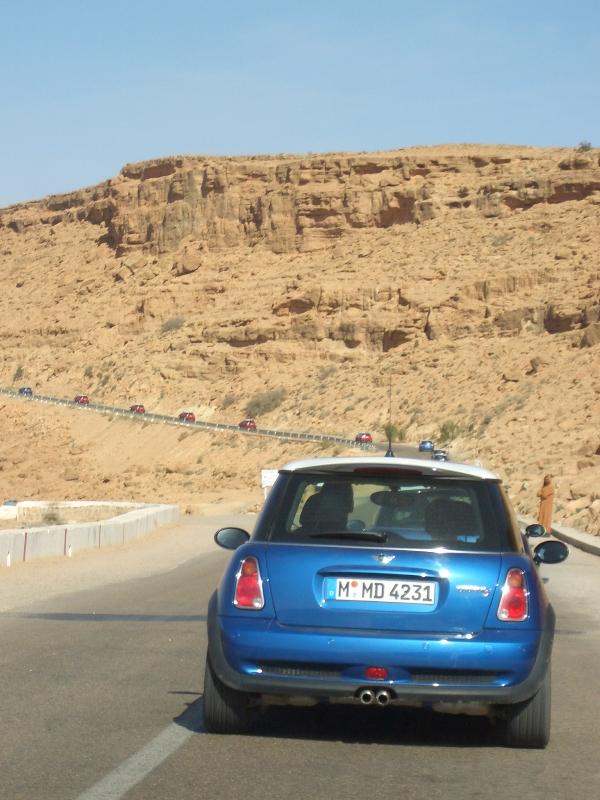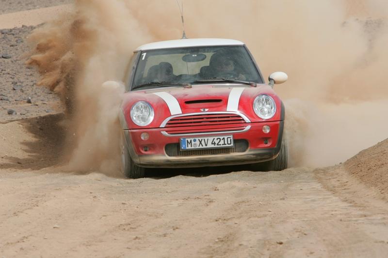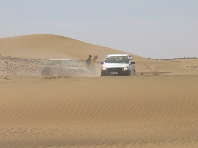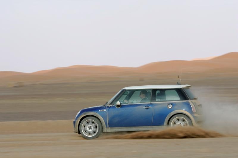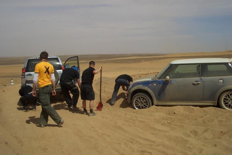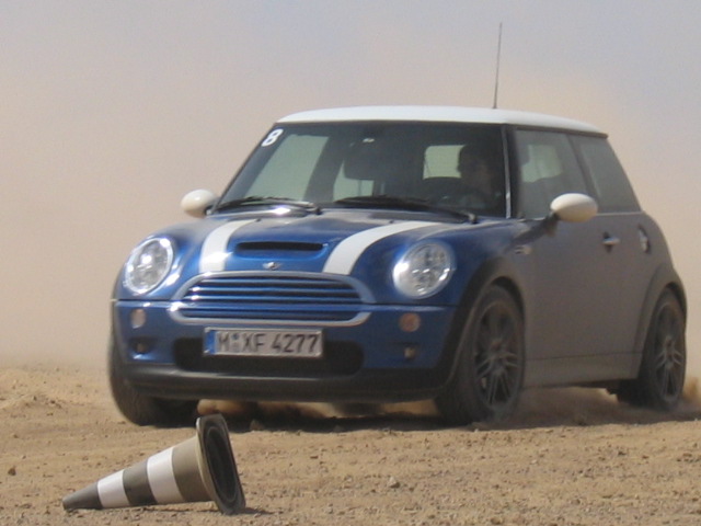 Aber mit der Erfahrung stieg auch der Übermut. Durch 3 Meter breite Kurven mit weit jenseits der 70km/h zu driften, ist äußerst befriedigend, allerdings kann es auch schnell mal zu schmal werden. Mein Kollege suchte zumindest seine eigene Linie im Sand     und musste feststellen, dass das nicht wirklich vorteilhaft war. Schieben und Sand wegschaufeln (wohin auch, war ja überall) nützte da nix mehr     und so hielt ein Toyota als Zugmaschine her und befreite den armen MINI aus seiner misslichen Lage     Bei dem Manöver wurde übrigens ein Reifen beschädigt. Aber RunFlat sei Dank, konnte das Programm ohne Probleme weiter abgespult werden.