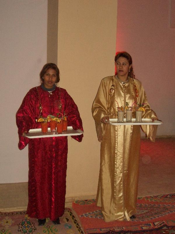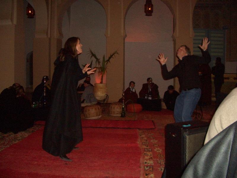 Ein Bus brachte uns nach Head Scratch … keine Ahnung wohin. Es war stockfinster und plötzlich sahen wir nur einen leuchteten Schriftzug, welcher an die Wand geworfen wurde.     Aber uns war klar: Hier sind wir richtig! In einem Innenhof wurde uns das Abendessen kredenzt,     Damen in traditioneller Tracht boten uns erfrischende Getränke an,     die Bauchtänzerin schwang ihre Hüften     während diese nette Gruppe     musizierte.
