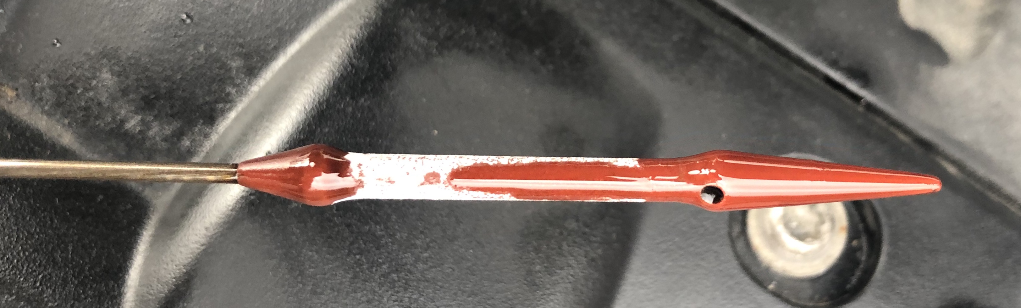 Kleiner Hinweis vorab: Du musst zum Messen den Stab mit der Spitze nach unten halten (wie in eingesteckter Position), ansonsten wird Dir das Öl immer am Stab entlang laufen und es kein präzises Ergebnis geben.