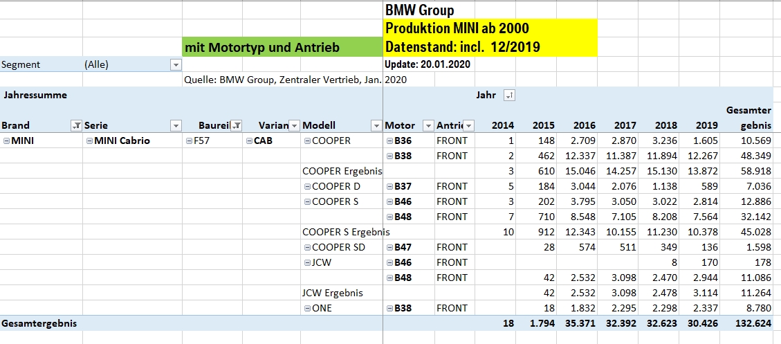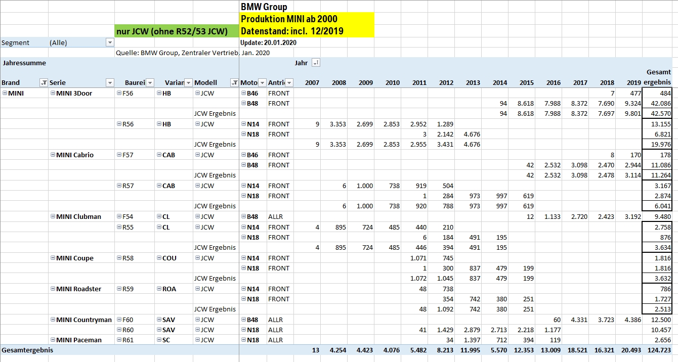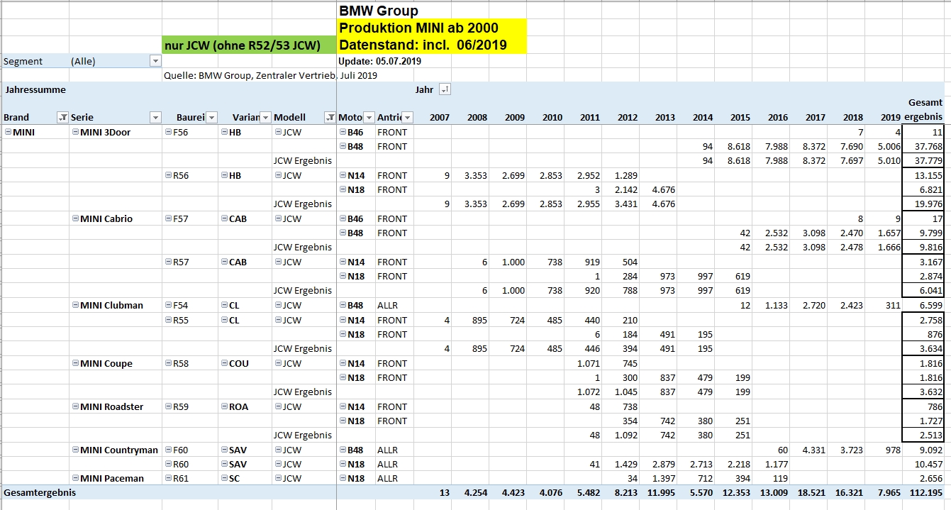 Erst durch Zahlenwerke, in denen Sonderausstattungen berücksichtigt werden, könnte man Stückzahlen von GP2, GP1, R52/R53 mit JCW ab Werk oder auch Automatikgetriebe herausfinden.