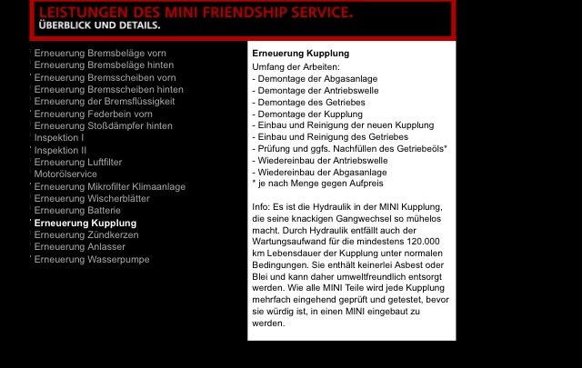 Ich weiß nicht was der MINI Friendship Service ist, ich kann mich auch nicht mehr genau erinnern wo dieses Bild oder Screenshot her ist, aber anscheinend glaubt MINI die Kupplung hält durchschnittlich 120.000km.... also ich hab meinen Mini mit 60.000km gekauft und bei 70. oder 80.000 war sie hin.