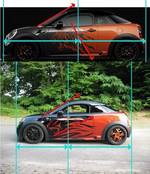 Ist wieder nahe beim Kotflügel, stimmt. Das hat allerdings einen guten Grund: der Kopf ist nun größtenteils wieder an der Scheibe ausgerichtet, was einem harmonischerem Gesamtbild entgegenkommt. Eventuell schieb ich ihn noch ein paar cm nach hinten. Priorität hat nun aber, dass die Farbanteile ausgeglichen werden. Heißt: in der oberen Hälfte noch etwas mehr Schwarz. Der Anhang dürfte verdeutlichen was ich mein.