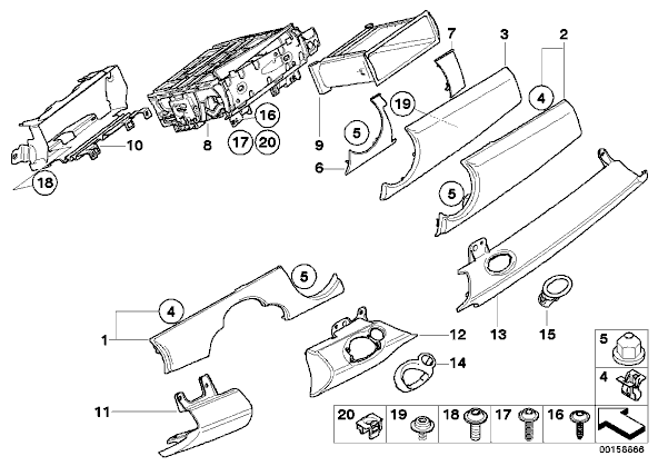 Wenn man das Teil 9 weglässt, hat man ein DIN-Autoradio Einschubschacht. Da passen dann auch locker Landkarten etc. rein. Kleinteile (Münzen etc.) können aber durch einen Spalt, hinter die Verkleidung, aufs Nimmerwiedersehen verschwinden.