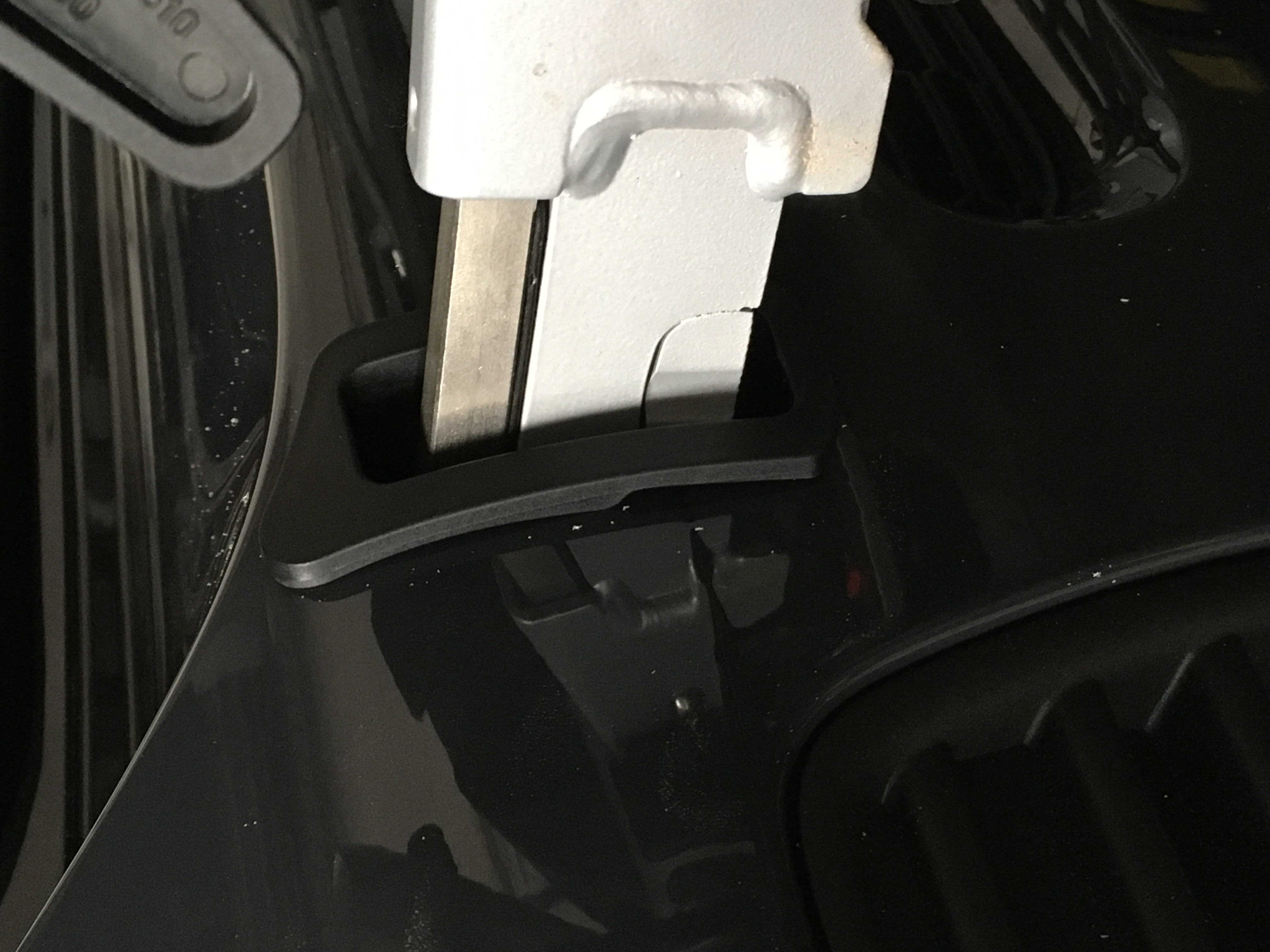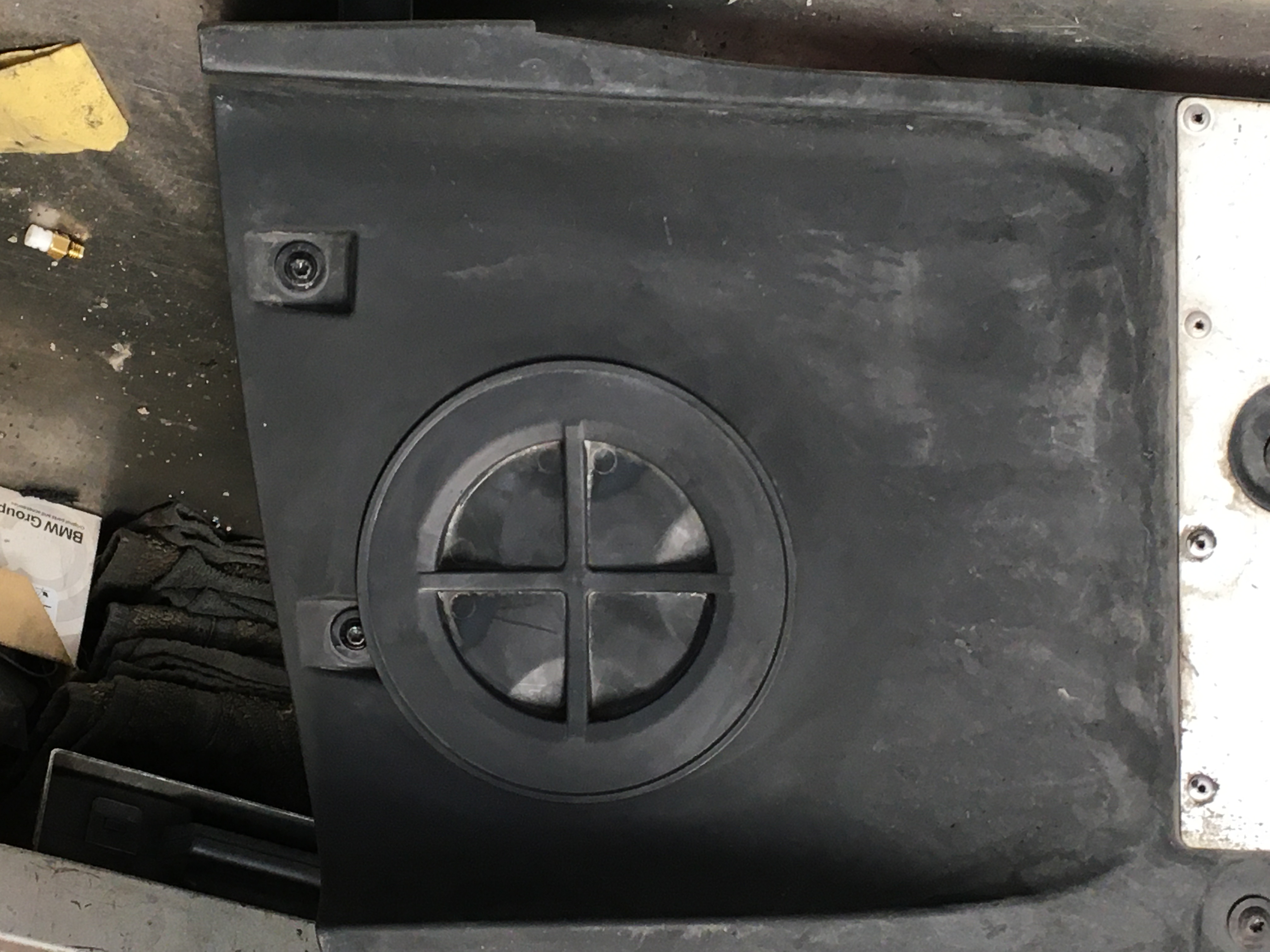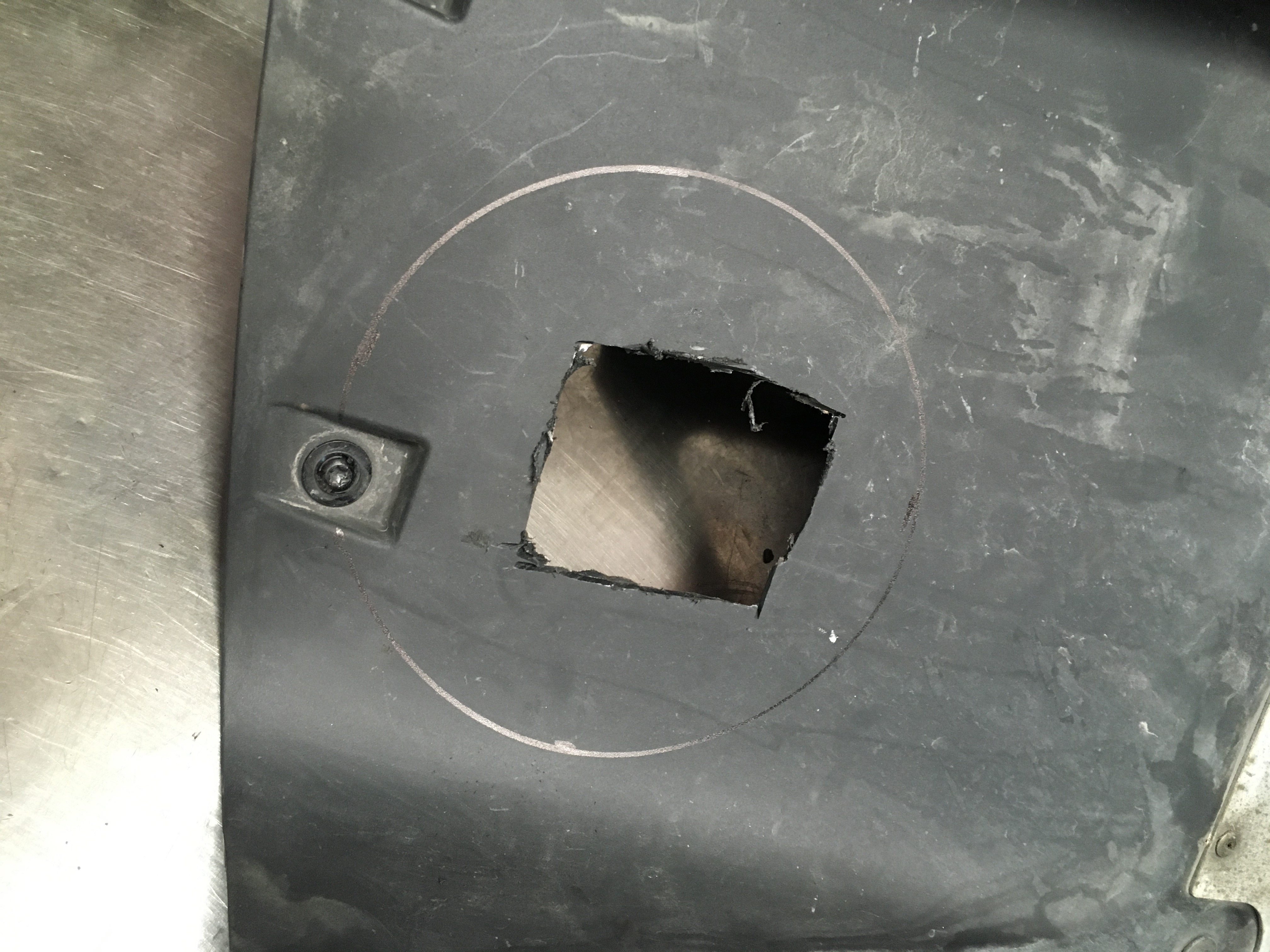 Das Loch im Diffusor müsste dann so groß werden, dass man mit einer Hand die Abdeckklappe der Steckdose öffnet, mit der anderen Hand den Stecker ansteckt und zum einrasten verdreht. Da das Verdrehen eher streng geht und nicht mit nur zwei Fingern machbar ist, sondern dazu die ganze Hand notwendig ist, müsste dafür dementsprechend ausreichend Platz in der Öffnung sein. Wie sich jeder denken kann, würde das dann ein doch recht großes Loch werden. Während mein Mech noch die genaue Lage für die Öffnung ermittelte und wir nebenbei über eine zweckmässige Abdeckung für diese Öffnung nachdachten, die aber nicht zu sehr nach einer Bastellösung aussehen würde, kam mir kleiner Geistesblitz. Ich ging an das andere Ende des kleinen Drachen und drehte beim Innenkotflügel die Abdeckung heraus, die den Zugang zu den Lampen in der Frontschürze verschloss. Mit dem Teil in der Hand und dem Gedanken „Könnte groß genug sein, könnte klappen!“ ging ich zu meinem Improvisateur und hielt es im unter die Nase. Er sah mich an, schmunzelnde kopfschüttelnd und nahm die Herausforderung still aber doch leicht augenverdrehend an. Beim immer wieder vorbei schlendernden Seniorchef habe ich gleich angefragt, ob er eine derartige Abdeckung in seinem Fundus hat. Keine fünf Minuten später hielt ich für den Gegenwert eines Automatenkaffees ein weiteres Exemplar in meinen Händen, platzierte das Original wieder an seinem ursprünglichen Einbauort und wir konnten den noch jungen Einfall gleich in die Realität umsetzten: