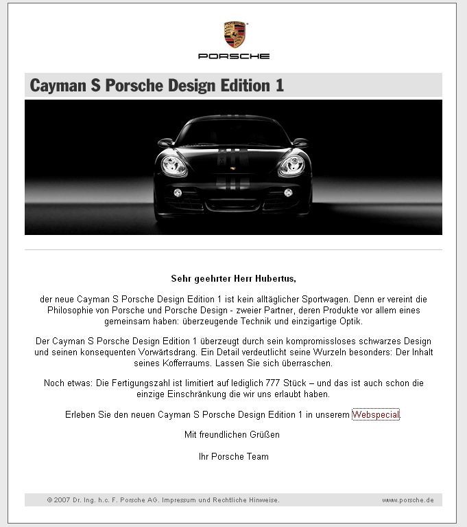 Ganz nette Idee den Verkauf des wohl nicht all zu gut ankommenden Cayman anzukurbeln, aber irgendwie hats auch ein bischen was von Reste-Verkauf in nem Ramsch-Laden wie man in Bayern so schön sagt