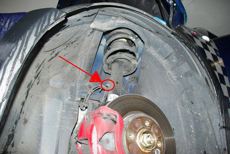 | Jetzt ist die untere Verbindung zwischen Dämpfer und Achsschenkel dran. (18-er Ringschlüssel oder Steckschlüssel). Dabei den Achsschenkel mit (z.B. Holzklotz) abstützen, da dieser nach unten sinkt. [Nachtrag: Position des Dämpfers im Achsschenkel vorher mit einem dünne Filtzstift markieren!] |