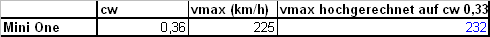 Ich habe mal nachgerechnet 1), wie schnell der Cooper S mit dem cw-Wert des Coopers laufen würde: 232 km/h!
