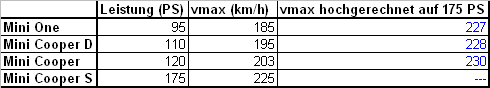 Als "Probe" habe ich dann noch die Höchstgeschwindigkeiten von One, Cooper D und Cooper bei einer fiktiven Motorleistung von 175 PS ausgerechnet: One kommt auf 227 km/h, Cooper D auf 228 km/h und der Cooper auf 230 km/h. Alles zwar keine 232 km/h, aber doch mehr als die 225 km/h des Cooper S.