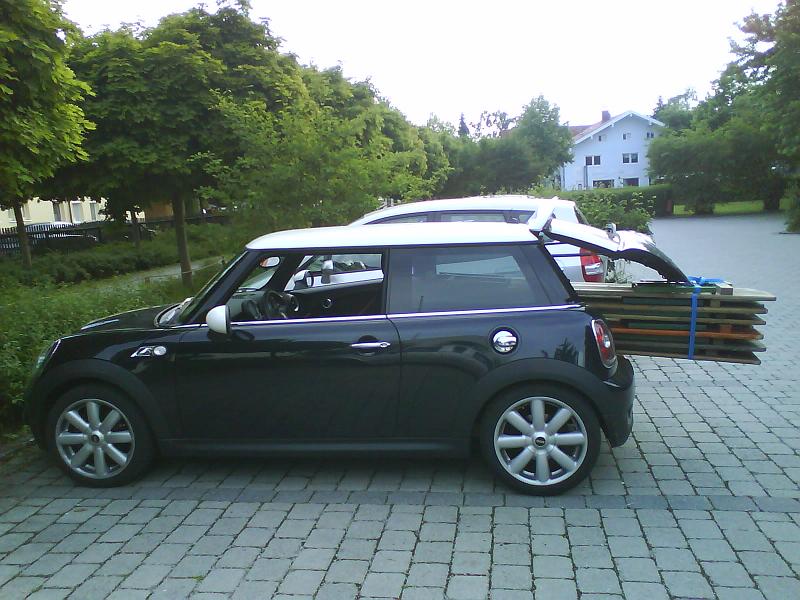 Grundvorraussetzung beim Mini war für mich, dass ich ein Rennrad reinbekomme. Vorder- und Hinterrad raus und schon passt alles Equipment rein: Rad, mindestens 4 Laufräder, Pumpe, Werkzeug, ne große Sporttasche und ein Beifahrer Top