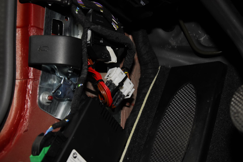 Das ganze jetzt 8x mit den 0,5er Litzen und 4x mit den 1,5ern. Dann den Stecker mit den einzelnen Adaptern verbinden (siehe Beitrag #113), die Kabel bündeln und im Bereich der Einbauposition fixieren. Das Steckerende, das mit dem Haken an der Bordwand befestigt wird, bleibt an der Originalposition und bekommt den schwarzen Stecker wieder übergeschoben. Das andere Ende des 'X9331' kann über dem Türsteuergerät fixiert werden (siehe Bilder). Ursprünglich sollten die Kabel nur ca. 50mm lang werden. Dies hätte aber dazu geführt, dass Kabel und Stecker nicht mehr hinter den Bowdenzug gepasst hätten.