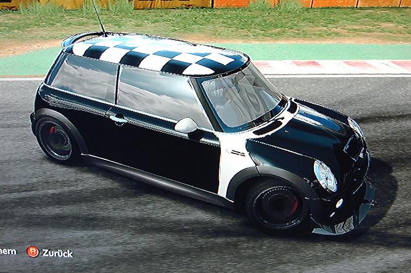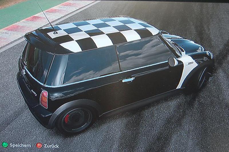 Hab, mal wieder Forza gespielt und hab da "meinen" MINI total cool gefunden und mit dem Gedanken gespielt ihn mir so bekleben zu lassen: (sry sind nur vom Bildschirm runter fotografiert Oops!)