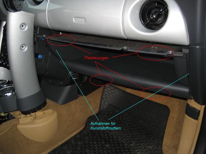 - Wer möchte kann nun die Kunstoffmuttern links und rechte in die Aufnahmen für das Handschuhfach drücken.