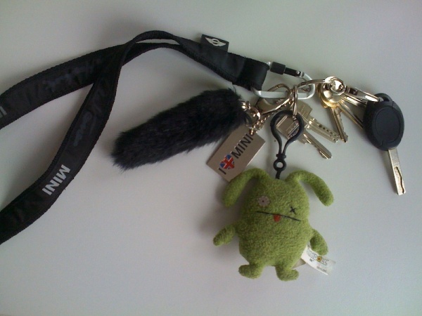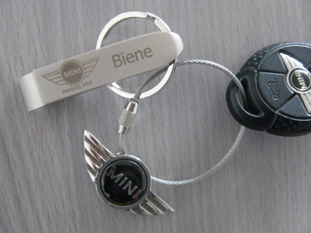 An meinem Schlüssel habe ich einen Lederanhänger vom "historischen Mini" mit der Aufschrift Mini Cooper.Habe ich bei einem englischen Händler auf der Motorshow in Essen gekauft.