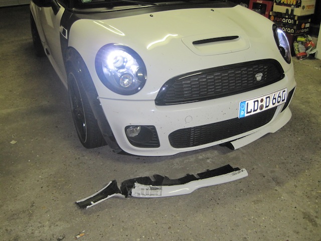 Bei der Serienfrontschürze vom JCW/S habe ich das Gefühl, dass die Frontschürze durch die Lippe viel Stabilität bekommt. Wenn die Lippe dann kurz vor dem Abreißen ist, verformt sich die Schürze noch leicht und .... zack