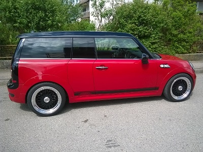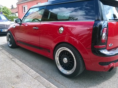 Servus hier mal aktuelle Bilder meines Clubbi mit den 7,5 x 17 Lenso BSX mit vorne 12 und hinen 10 mm Spurverbreiterung; hab dann auch gleich noch die Kunststoffteile lackieren lassen und mir Seitenstreifen angeklebt; finde so sieht das Ganze retro aus.. Tüv war ich nicht, wird im Juli passieren, ich berichte dann wieder...