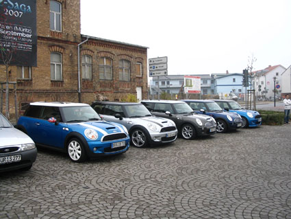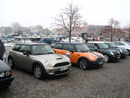 Vereinigt und übermütig startete die mittlerweile 9er-Kolonne Richtung Waren, wo wir uns mit Biwi an seinem Autohaus trafen. Da Willi abe noch weiterarbeiten musste, sollte er erst später mit Bine dazustoßen. Alle anderen fuhren weiter an den Warener Stadthafen, wo die Fülle an gleichartigen Fahrzeugen bei manchen Passaten Wellen der Euphorie und des Unglaubens auslösten. Manch ein Warener schien noch nie einen Mini gesehen zu haben...