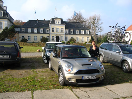 Mit dem "Rest" ging es über die scheinbar für Minis entworfene Kurvenstrecke zurück nach Waren. Bei diesem letzten gemeinsamen Stop verließen uns dann noch Caro und Tobias (aus Berlin), die ebenfalls nach Hause mussten. Mit den verbliebenen ging es mit Biwi nach Schorssow, einem malerisch gelegenen Schloss in der Mecklenburgischen Schweiz, wo wir Rücken an Rücken mit der doch in die Jahre gekommenen Glücksrad-Fee Maren Giltzer Kaffee und Kuchen bekamen. Der gute Kuchen und das tolle Ambiente (zu dem wir Maren Giltzer auch mal zählen) konnten jedoch nicht über die schlechteste heiße Schokolade der Welt hinwegtrösten, die gleich drei von uns bestellten. Auch Daniels Anspielungen beim Bezahlen schienen den Missstand nicht aufdecken zu können...