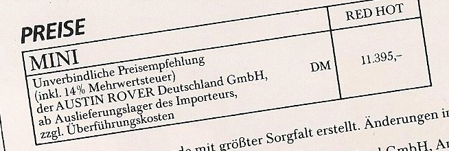 MINI One Grundpreis in € 14.500,- inkl. 16% MwSt. = € 12.500,- Netto