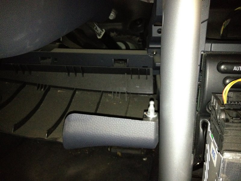 Solltest dein MINI eine Blende mit einem kleinen Ablagefach unterhalb des Lenkrads haben, so kannst du diese, ähnlich wie den Handschuhfachdeckel nach unten klappen. Diese Blende ist mit 2 Metallschnappern (jeweils links und rechts) fixiert. Wenn sie nicht auf Anhieb runterklappt ruhig beherzt ziehen und runterklappen.