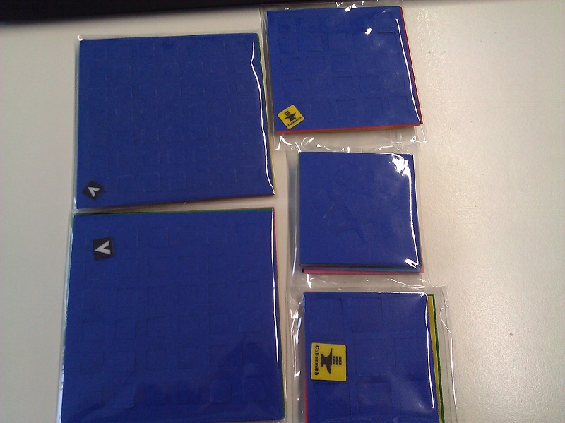 Das sind Sticker für den V-Cube 7 (oben links), den V-Cube 6 (unten links), den V-Cube 5 (oben rechts), den normalen 3x3x3 in der Standardgröße (unten rechts) und den Megaminx (mitte rechts). Alles Würfel deren Sticker bei mir durch Abnutzung schon ziemlich durchgelutscht sind. Also gibt es jetzt neue.
