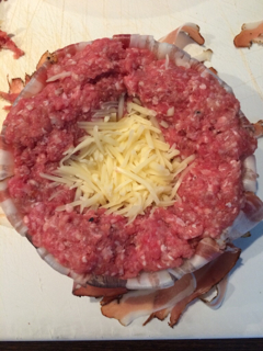 Danach eine kleine Schüssel oder Ähnliches nehmen und Speck darin ausbreiten. Der soll dann auch noch über den Rand schaun. Danach etwas vom vermischten Faschierten darin ausbreiten und nach Belieben füllen. Ich hab einfach mal geriebenen Ementaler versucht.