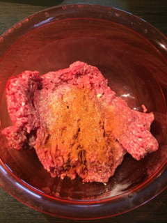 Faschiertes nach belieben würzen. Bei mir war es Salz, Knoblauchgranulat, schwarzer Pfeffer, Cayennepfeffer, Zwiebelgranulat.