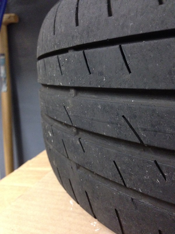 Interessanter Weise genau symmetrisch links und rechts, jeweils Innen fast an der Verschleißmarke. Mitte und Außen noch gut Profil.