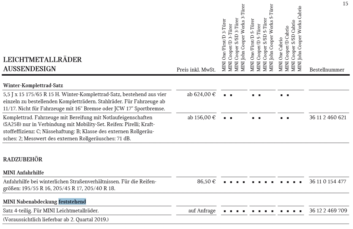 Zurück zu den Nabenabdeckungen: Mit Tante Googles Hiilfe habe ich eben mal nachgesehen: Die R50, R52 und R53 haben einen Nabendurchmesser von 56,1 mm und der F54 hat einen Nabendurchmesser von 66,6 mm. Also müsste es solche Nabenabdeckungen mit anderem Durchmesser geben und damit würde ich nicht rechnen. Im Kfz-Bereich ist es normal, dass Hersteller und Importeure nur die neueren Modelle mit Zubehör versorgen.
