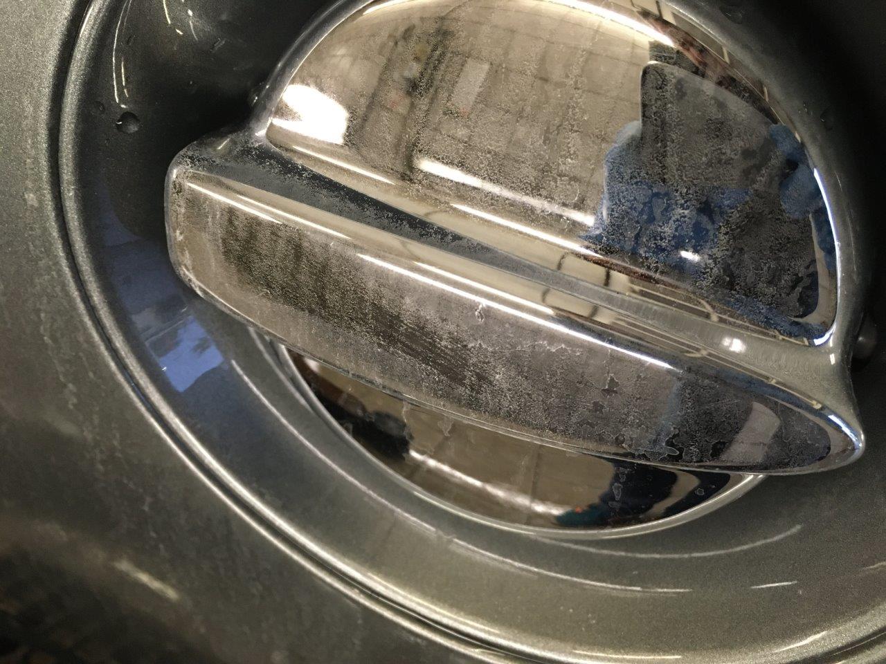 Ich resignierte und beschloss die Kollegen unserer Aufbereitungsabteilung später um Rat zu fragen. Vormittags habe ich den Schaden der Hausverwaltung gemeldet und dabei Bilder und Videos angefügt damit alles dokumentiert ist. Als unsere Fahrzeugaufbereiter eine ruhige Minute hatten, habe ich ihnen die verkrustete Maus hingestellt und sie haben es nochmals mit dem Vorreiniger versucht, dann noch mit einem Essigreiniger und noch einem weiteren Mittelchen. Nichts davon konnte den Belag lösen oder aufweichen, sodass der Hochdruckreiniger ihn sanft entfernen würde können. Schlussendlich konnten sie dann in mühsamer Handarbeit mit der Reinigungsknete die unerwünschte Ummantelung großteils entfernen. Einige Rückstände blieben immer noch und der Lack wurde ziemlich in Mitleidenschaft gezogen. Dark Silver Metallic ist eine ziemlich dankbare Farbe, am Dach in Schwarz Uni waren die Spuren jedoch überdeutlich sichtbar. Zerkratzt von der Entfernung der Ablagerungen und teilweise sogar angegriffen von ebendiesen präsentierte sich nun die Lackschicht. Eine ordentliche Politur war das Mindeste, was nun als weiterer Schritt notwendig war. Wenn nicht sogar eine Lackierung die einzige Möglichkeit zur Behebung des Schadens sein würde.