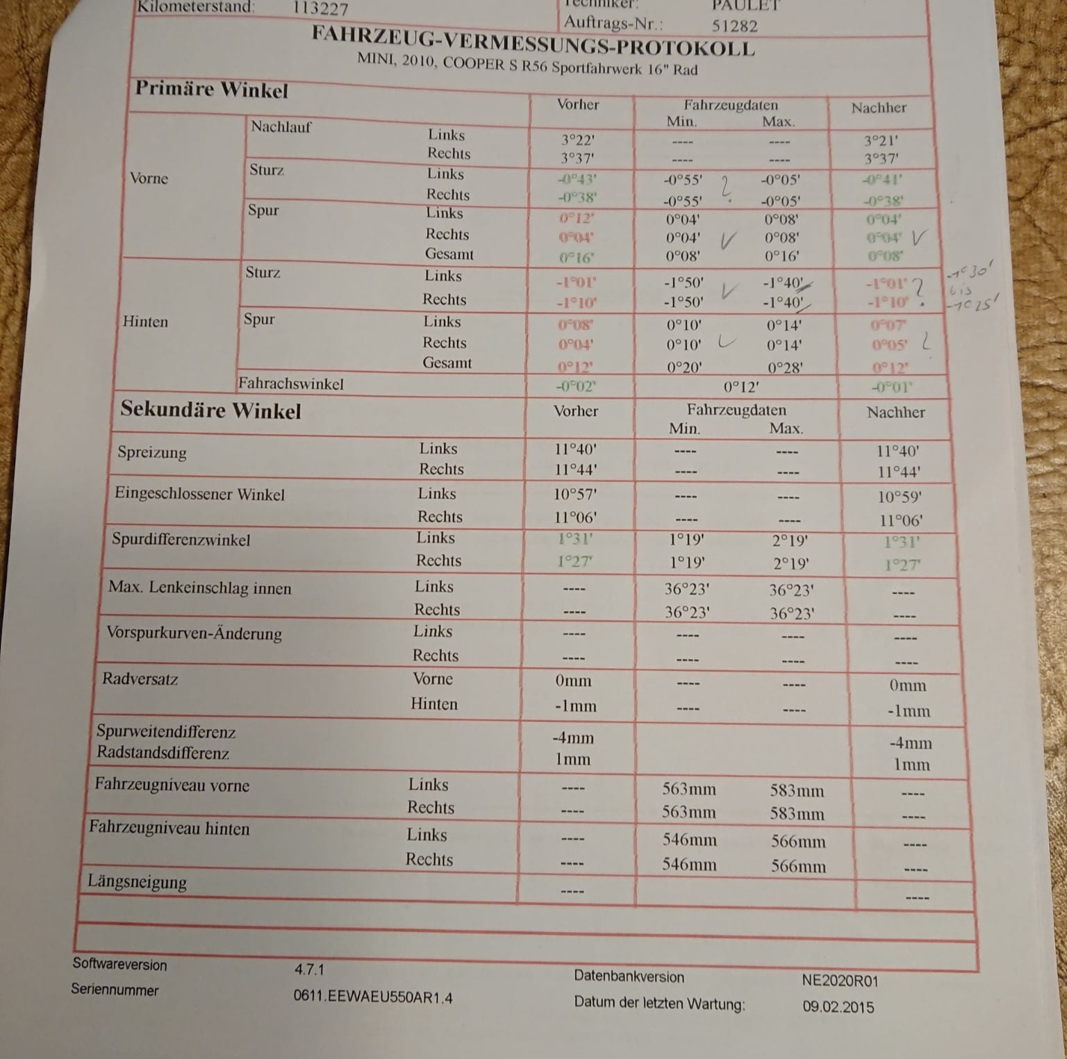 Mein MCS Facelift mit Serienfahrwerk war kürzlich beim KFZ check in einer freien Werkstatt. Dort wurde mir gesagt, dass die Vorderachse etwas außerhalb der Toleranz sei und ich die nachstellen lassen sollte. Haben mir daraufhin das vorgelegt.