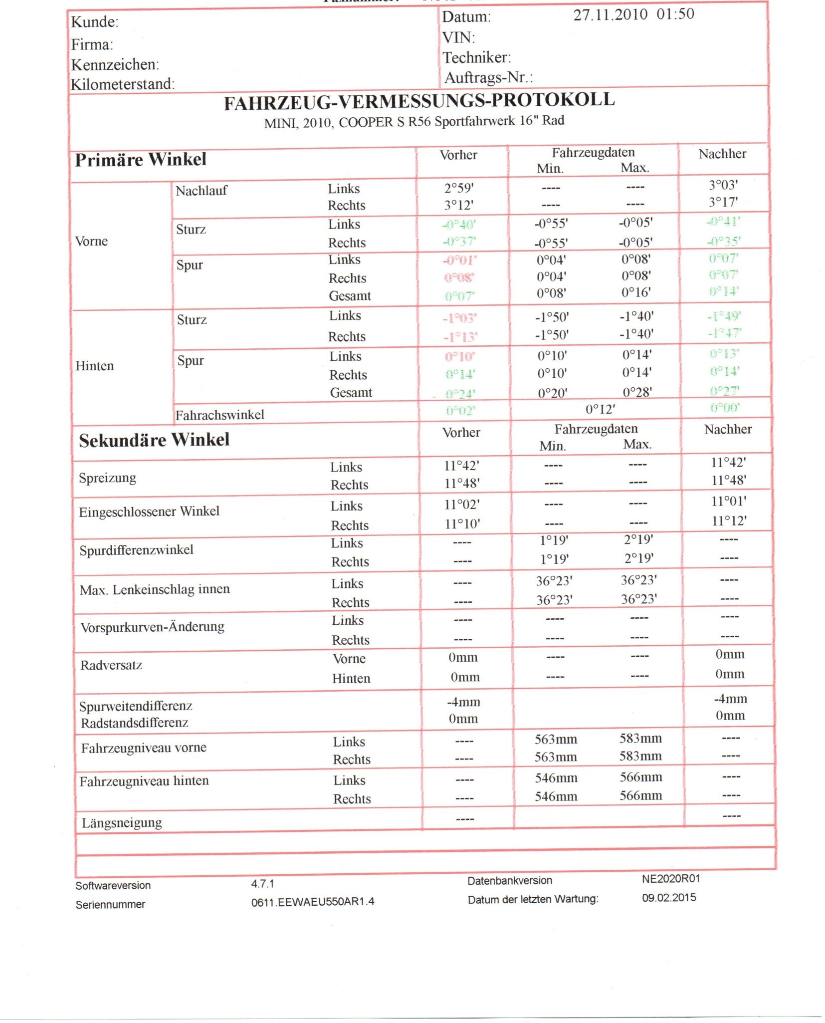 So, war jetzt nochmal vor Ort und hab um Nachbesserung gebeten. Der Werkstattmeister hat dann selber Hand angelegt und alles eingestellt. Zwar nicht ganz so wie ich es wollte aber immerhin sind es nun Werte innerhalb der BMW/Mini Toleranzen. (Deren Werkstatt ist wohl eine Zeitmaschine. Das Protokoll ist fast 12 Jahre alt)
