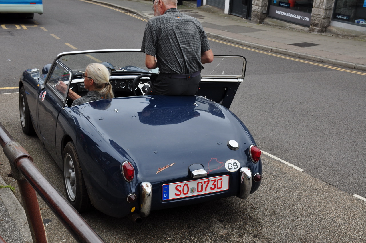 Austin Healey, Baujahr 1959, enthält sozusagen "Mini-Technik" (laut Besitzer), das Fahrzeug war schon bei den Nürburgring Klassik dabei, Anreise nach GB aktuell auf dem Anhänger des Wohnmobils