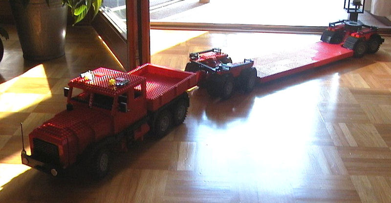 Hier mal ein paar Photos von einer meiner Kreationen. Gebaut nach Photos in 2002. Der LKW gibts noch heute in der Vitrine. Der Hänger war mit über einem Meter "etwas" zu groß zum Aufheben. Leider habe ich nur diese 3 Bilder. Den kriege ich nie wieder so zusammen. Traurig