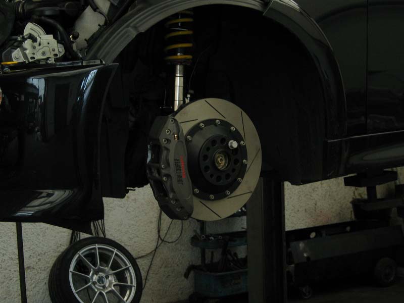 Die Bremse ist bei der gebotenen Leistung doch etwas zu schwach und auch auf der Rennstrecke sollte dieser MINI ein gutes Bild abgeben. Was nehmen wir bloß?Head Scratch Uns kam der Gedanke, dass eine Challenge Bremsanlage genau das richtige ist. Auch das haben wir verwirklicht und der MINI bremst nun tatsächlich mit einer originalen John Cooper Motorsport Bremsanlage aus der Challenge.