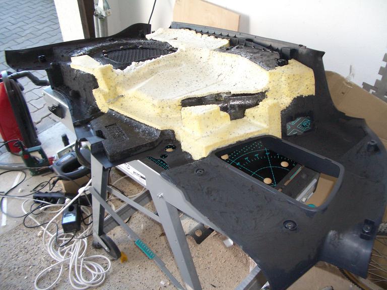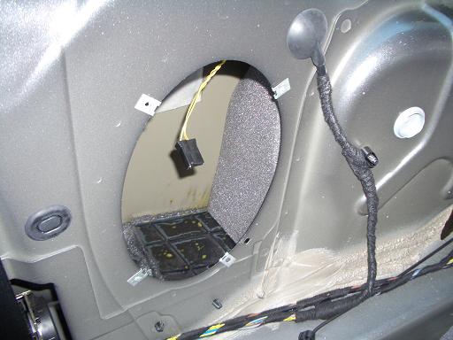 Änderungen an den Seitenverkleidungen: Um auch hier Vibrationen weitestgehend zu minimieren wurden die Innenseiten mehrlagig mit Exvibration Paste bestrichen (vorher die Schaumstoffteile abbauen, danach wieder anbringen). Das Original-Lautsprechergitter der Ovallautsprecher hat eine zu geringe Schallöffnung. Daher wurden zusätliche Öffnungen rausgesägt und das ganze Gitter dann mit Akustik-Bespannstoff bezogen. Um sicher zu gehen, dass der Subwoofer bei Maximalauslenkung nicht an die Verkleidung stößt wurden noch einige Distanzhalter im Bereich des Lautsprechers angebracht.