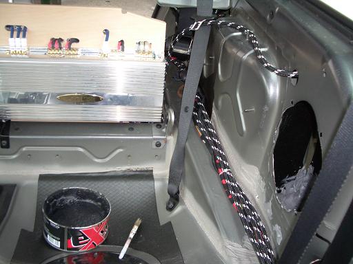 Weiteres Problem: die "Subwoofergehäuse" (Bereich zwischen Mini-Außenwand und Innenwand Fahrgastraumblech) ist nach hinten (zu den Rückleuchten hin) offen. Das musste also möglichst weit hinten (maximales Gehäusevolumen) abgedichtet werden (vorher Lautsprecherkabel verlegen). BMW hat einen "doppelten Boden" aus 2 Plastikplatten in die Seitenwand eingebaut. Für eine ordentliche Dynamik sind diese viel zu instabiel und wurden daher entfernt (auch um mehr Volumen zu erhalten). Diese Abdekungen haben aber einen klaren Grund: Für die Gurtrolle für Fahrer/Beifahrer wurde eine grosse Aussparung im Seitenblech erstellt. Durch diese Aussparung ist das "Subwoofergehäuse" über einen nicht auf den ersten Blick ersichtlichen Schlitz offen - also kein geschlossenes Gehäuse. Daher muss die zuvor entfernte Plastikplattenabdeckung wieder eingabaut werden, allerings viel weiter unten (mehr Volumen) und viel stabieler (Holzkonstruktion mit Dichtungskleber).