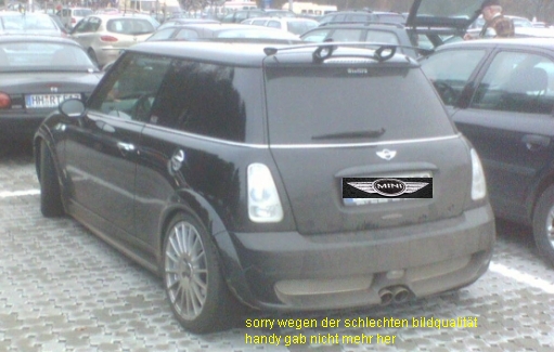 schwarzer mini, weiße rückleuchten, schwarze scheiben, bm pipes, oz winterreifen, cooper s, aeropacket, lackierte radläufe, heckflügel,......na kommt ihr drauf Lol