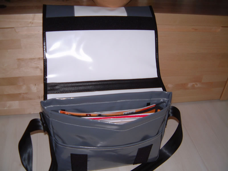 - gibt es standardmäßig mit einer Einschubtasche, die über die komplette Frontseite verläuft und einer Reißverschlußtasche an der inneren Rückwand, die etwa DIN A5-Größe hat. Dazu gibt es noch zwei Einschubtaschen für Mobiltelefone oder ähnliches, die an der Außenseite unterhalb der Gurthalterungen angebracht sind (bei meiner Tasche habe ich die beide nach innen verlegen lassen). Es passt alles rein, was so groß ist wie ein T610 oder V600i; bei V800 oder grösser wirds allerdings eng...