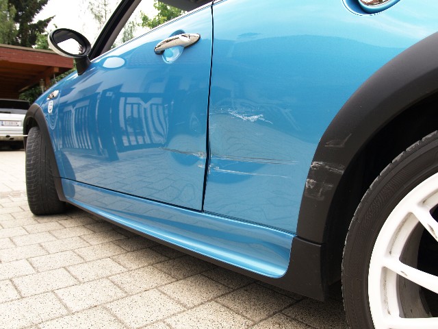Fahrertür und Links Hinten hab ich jetzt eindellungen und Kratzer. Die Felge Links hinten hat gummispuren und Kratzer.