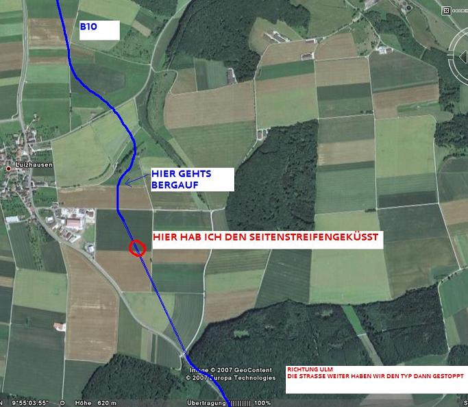 Das ganze passierte heute morgen um ca 9.00 auf der B10 Richtung Ulm auf höhe (Neu)Denkental. Dort wurde vor kurzen ein schöner neuer Umgehungsabschnitt fertig gestellt. Erlaubte Geschwindigkeit: 100 km/h.