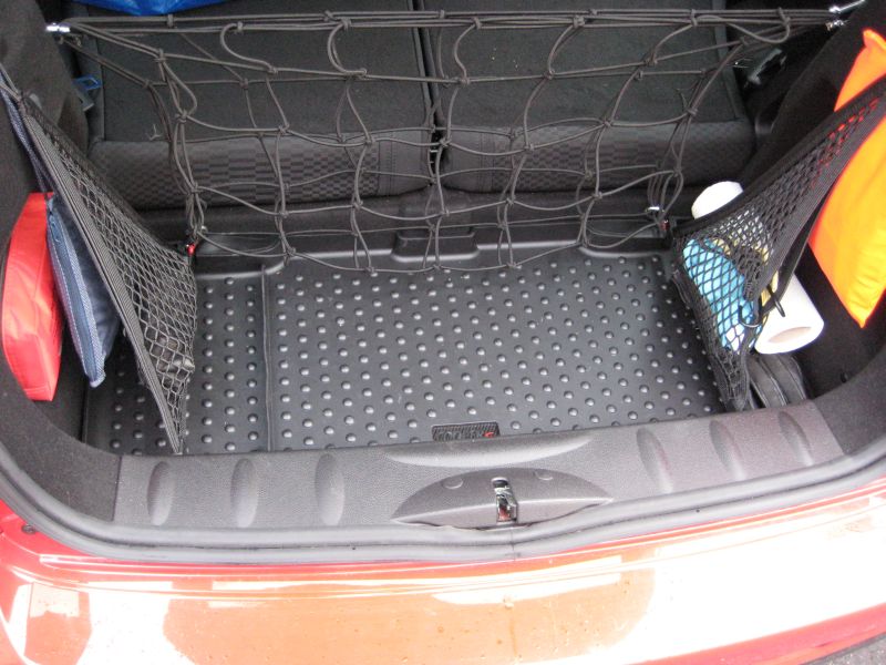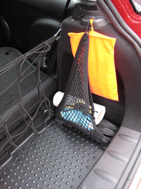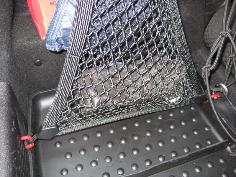 Im Originalzubehör von MINI gibt es doch die Seitennetze - ich habe sie mir gekauft (für rechts und links). Die haben selbst eine Öffnung (man kann also etwas reintun) und teilen dann die rechte Ausbuchtung noch mal in ein eigenes Fach ein sozusagen. Ich mache nachher mal Fotos davon.