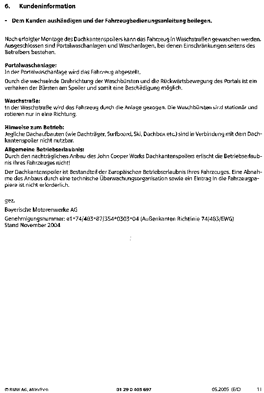 "Durch den nachträglichen Anbau des JCW Dachkantenspoilers erlischt die Betriebserlaubnis Ihres Fahrzeuges nicht!