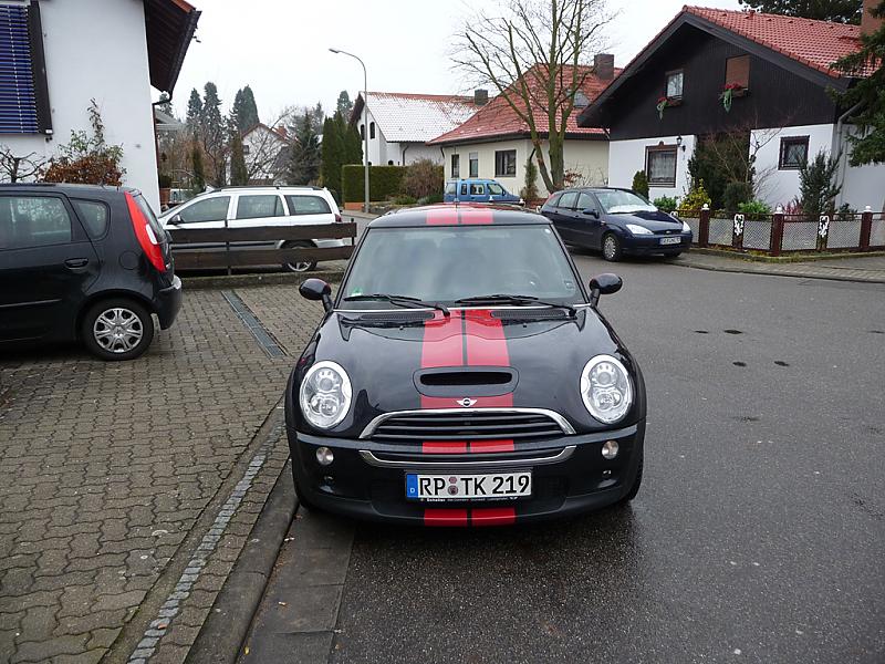 schick hält das auf der unlackierten spoilerlippe? und wenn du die spoilerlippe schon beklebst, sollten auch die lamellen des grills konsequent mitbeklebt werden. die idee mit dem roten ring am spiegel finde ich klasse, bei dir bloß ein wenig rot zu viel, weil es der dritte streifen mit einer unterschiedlichen breite ist. den weißen john cooper würde ich durch einen schwarzen ersetzen, der nur im rot des schwellers zu finden ist.