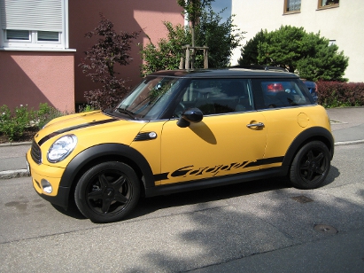 Das größte Problem der Aufkleber ist, das es keinen linken und rechten Kleber gibt, sondern alle gleich lang sind und der Cooper Schriftzug an der der gleichen Stelle positioniert ist. An der Fahrertür passt diese Ausrichtung dann auch perfekt.