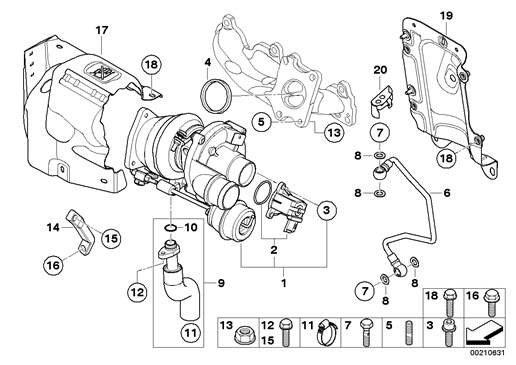 Nach einer Überprüfung wurde festgestellt, dass die Ölleitung mit Nr.6 (Bild gegoogelt) an der Stelle, an der sie in den Turbo führt kaputt ist und Öl austrat, was den Geruch verursachte. Jetzt muss diese Ölleitung ausgetauscht werden. Dazu muss, laut BMW Mini Meister vieles ausgebaut werden, wahrscheinlich sei sogar der Turbo kaputt. (Leistungsminderung konnte ich bisher keine feststellen). Ich nehme an, dass er einer "unwissenden Frau" Angst machen wollte, da die Leitung, wie ich beim googeln feststellte 38 € kostet.